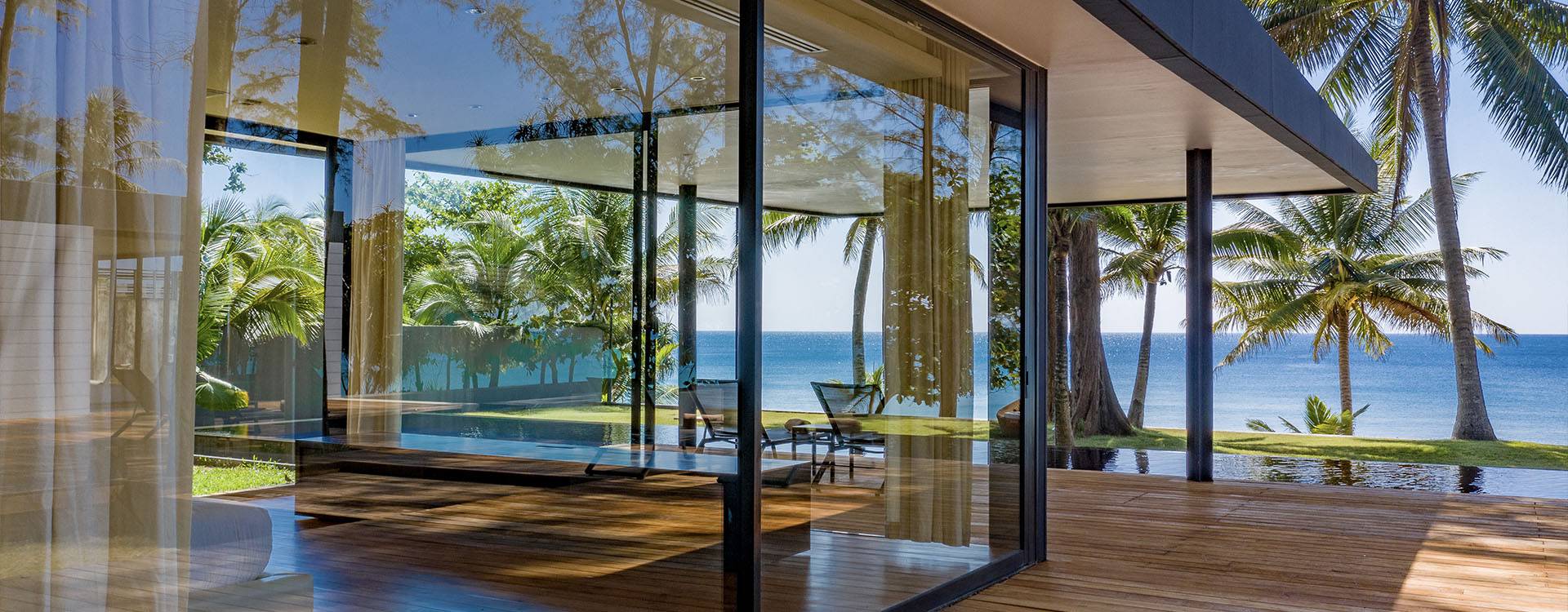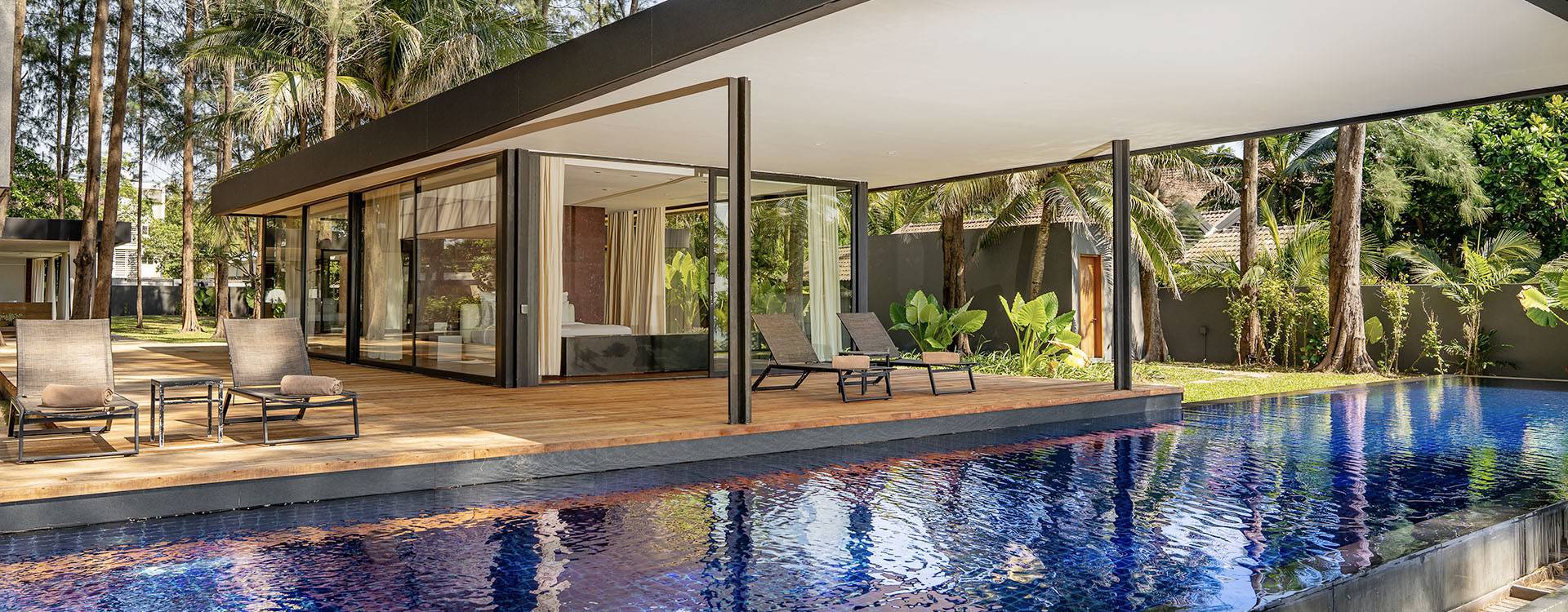 Grand Villa Noi is a spectacular glass-walled five-bedroom villa set along the unspoilt beachfront of Natai Beach, in northern Phuket. Nestled amongst a verdant tropical garden, the designer villa is shaded by towering casuarina trees. Modern architecture, stylish living spaces, and a gorgeous infinity swimming pool make this the holiday home of your dreams. Unwind and relax while enjoying mesmerizing views of the Andaman Sea, as the villa’s friendly, professional staff look after your every need and provide the best that Thai hospitality has to offer.
